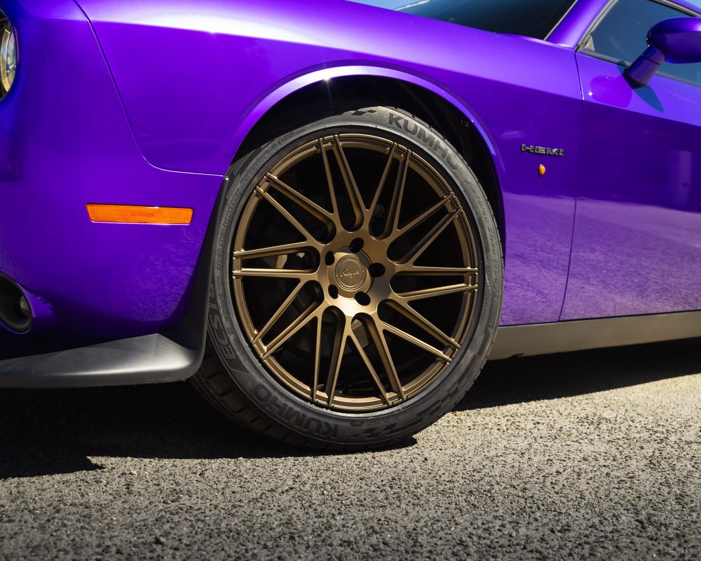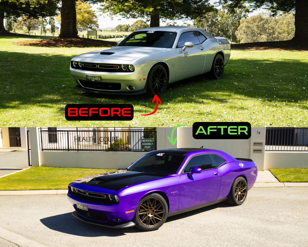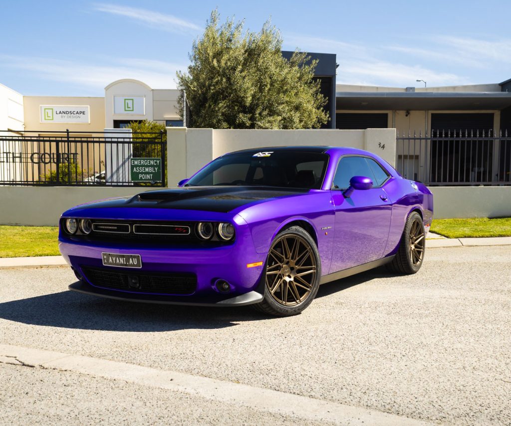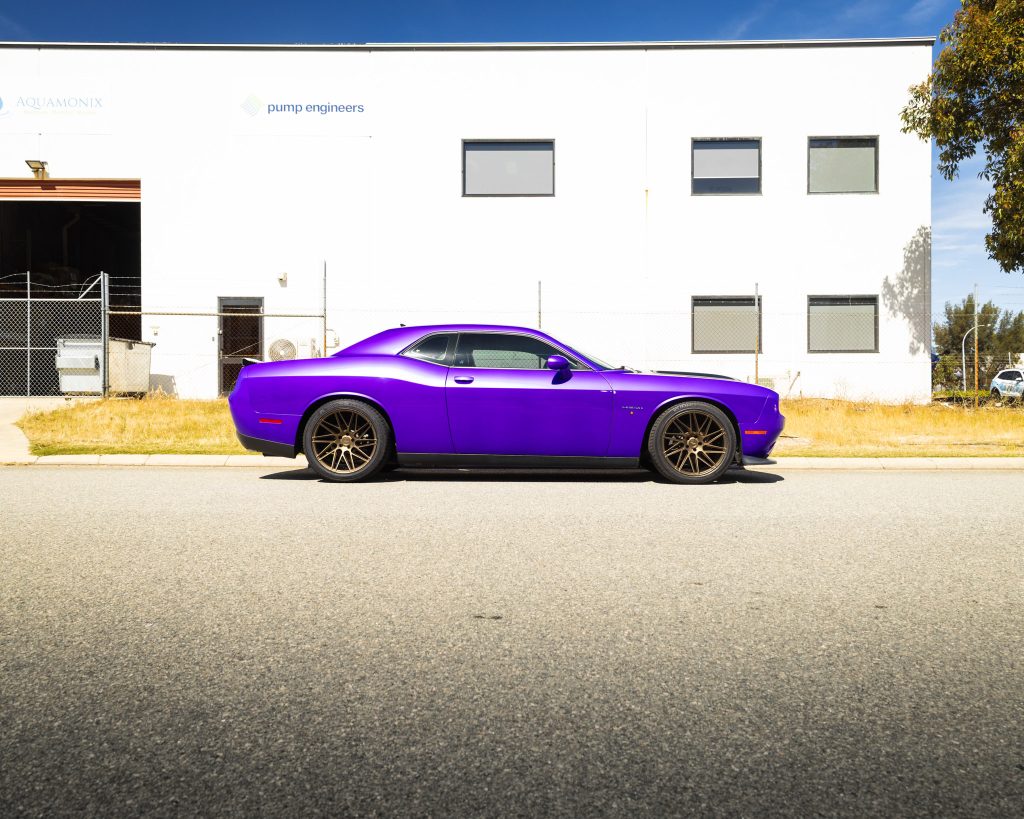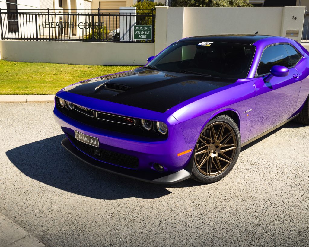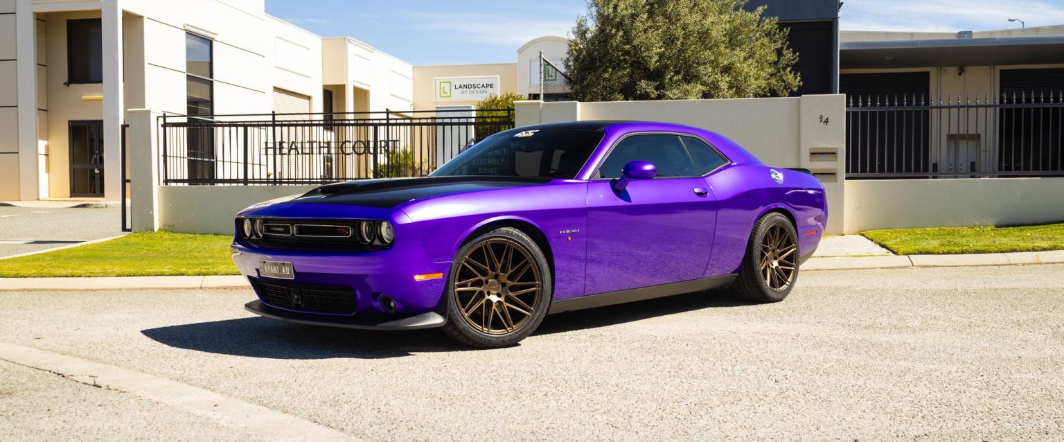 What started as a clean, factory-fresh silver Challenger has been transformed into a full-blown purple monster.